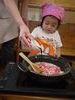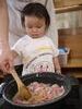 鍋で、りんご、豚肉を調味料と一緒に炒めます