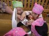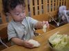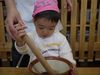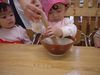 説明をきいて、カップにヨーグルトとオートミールを入れます