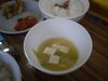 お湯の中に、鰹節と出汁顆粒、キャベツ、豆腐、すりごまを順次入れて、味噌を溶きます